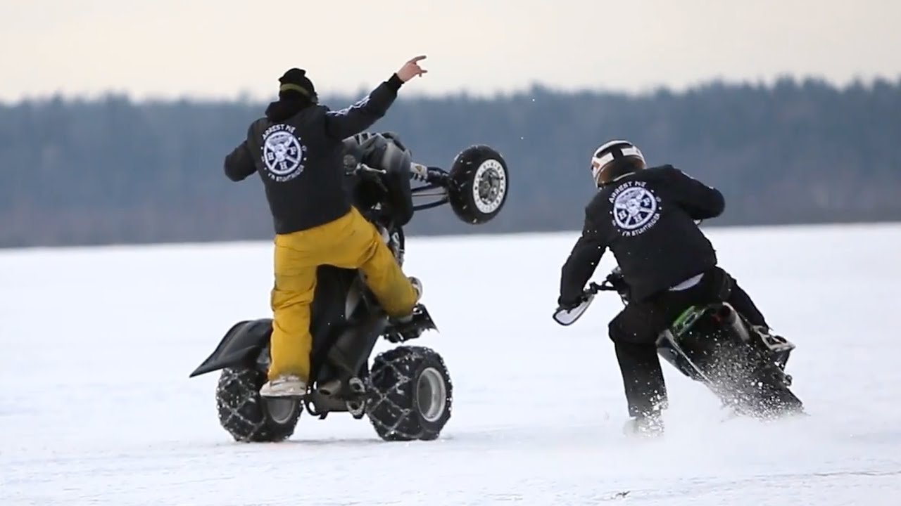 Команда HHF (Happy Huge Family - https://vk.com/hhfstunt) этой зимой замутили веселые треш-покатушки на озере в подмосковье. Температура была выше нуля, снег таял, но HHF это не остановило! Очистка трассы заняла целый день. Пришлось ремонтировать технику, устанавливать цепи и шиповать колеса. Идей было много, но реализовать все не получилось. В режиме дрифта цепи не выдержали нагрузок: слетали с колес и разбалтывались, но несколько трюков на квадроцикле удались. С мотиками проблем было меньше, шипы нормально держали, но кроме дрифта ничего не получилось из-за плохой трассы. Уазик и Волга поехали в последний день.