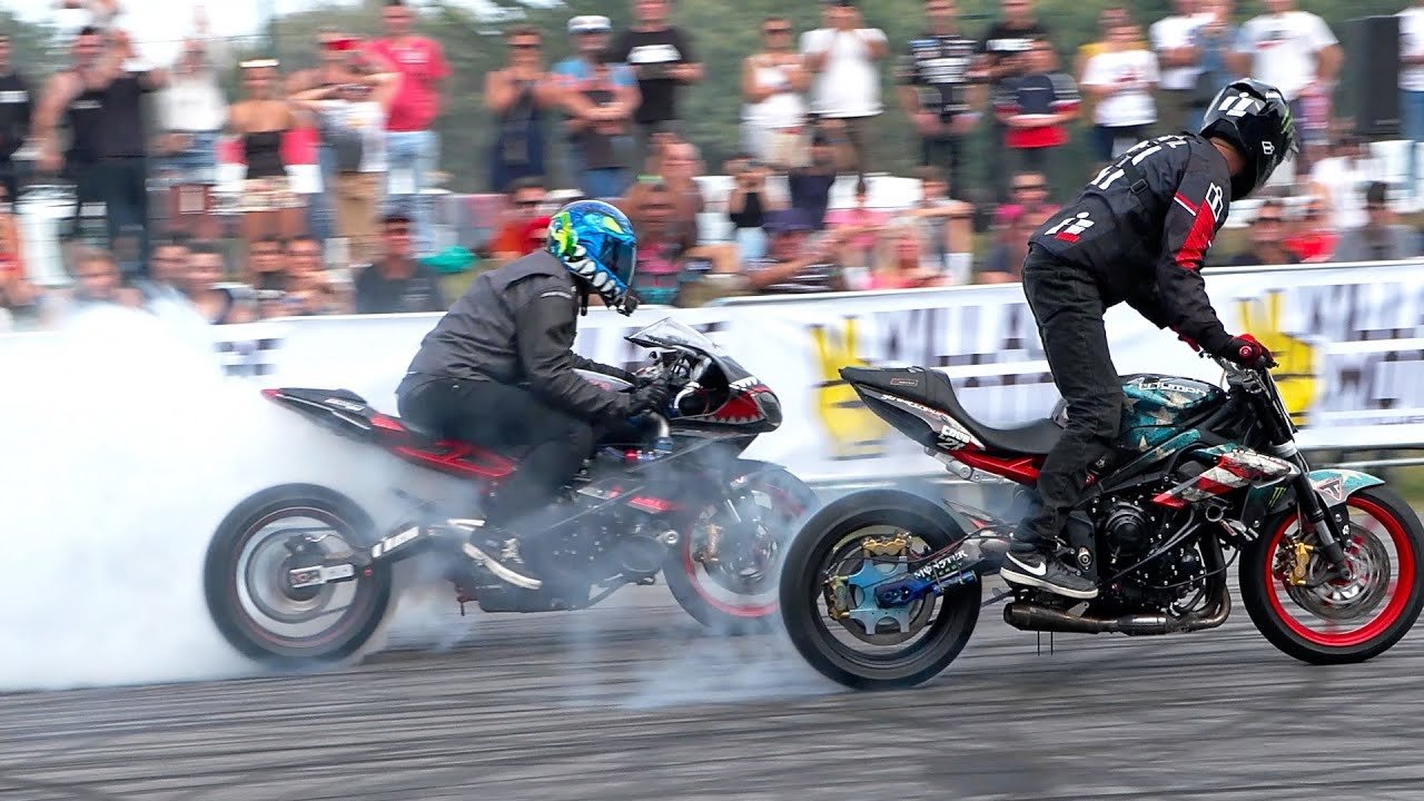 Джулиан выступает на турбированном дрифт байке с удлиненным маятником, на базе Triumph Daytona 675. У Ерни классический стантбайк на базе Triumph Street Triple.