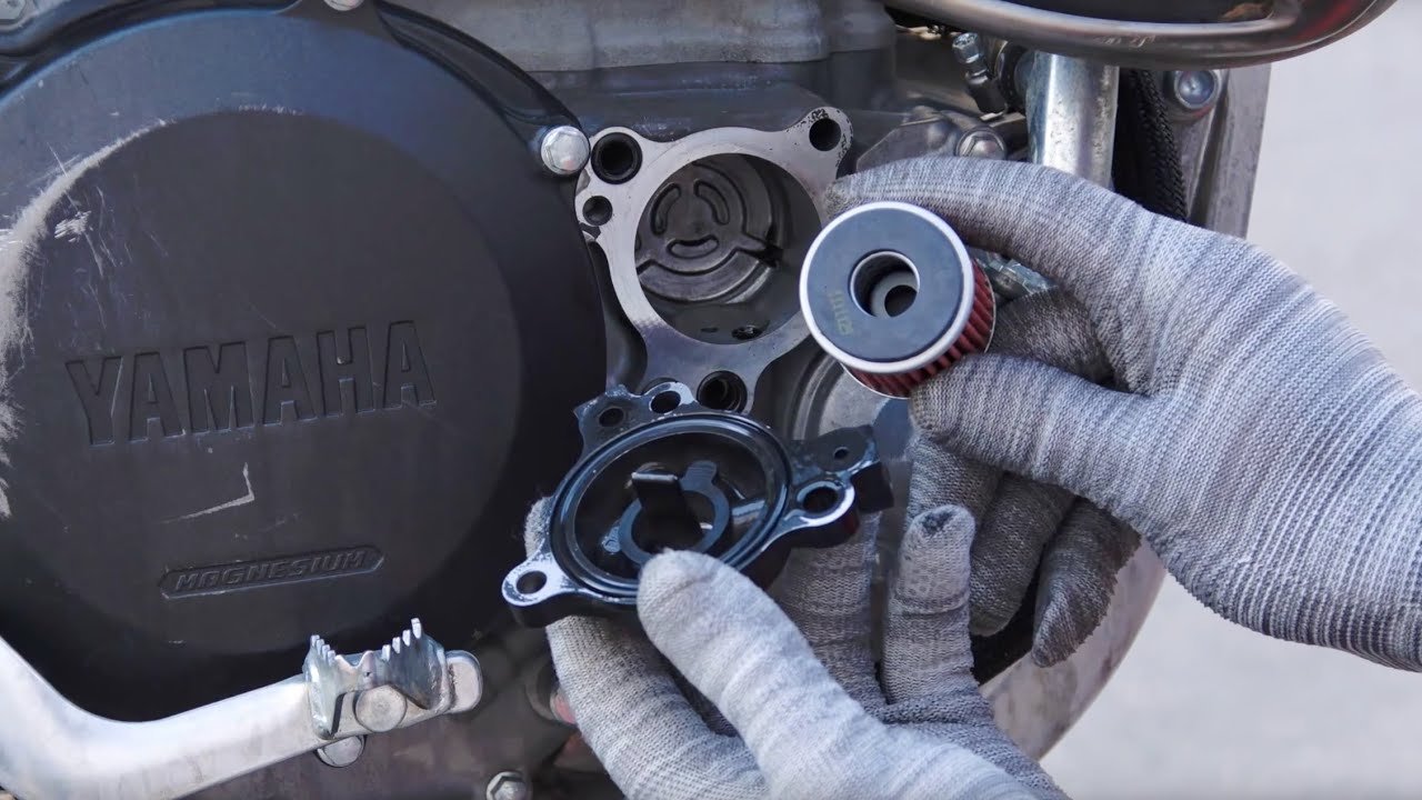 Before using Suprotec, the surfaces of the moving engine parts must be cleaned with a special rinse. Given the service intervals, life service and engine type, it makes sense to pour in the cleansing agent 30-40 km before changing the oil. Before oil changing, you poir in the Suprotec oil additive into the fresh oil. It is very important to stir it well so that there is no sediment on the bottom. Engine protection is carried out in two stages. The second stage is a similar oil change with the addition of an additive after 300 km. After that just the usual motorcycle operating. In general, the procedure for the oil changing on the Yamaha WR450 is quite standard. There are 3 points for running off the oil. If you swing and tilt the motorcycle, you can drain almost all the oil. When replacing the filter, it is important not to lose the rubber spacers!